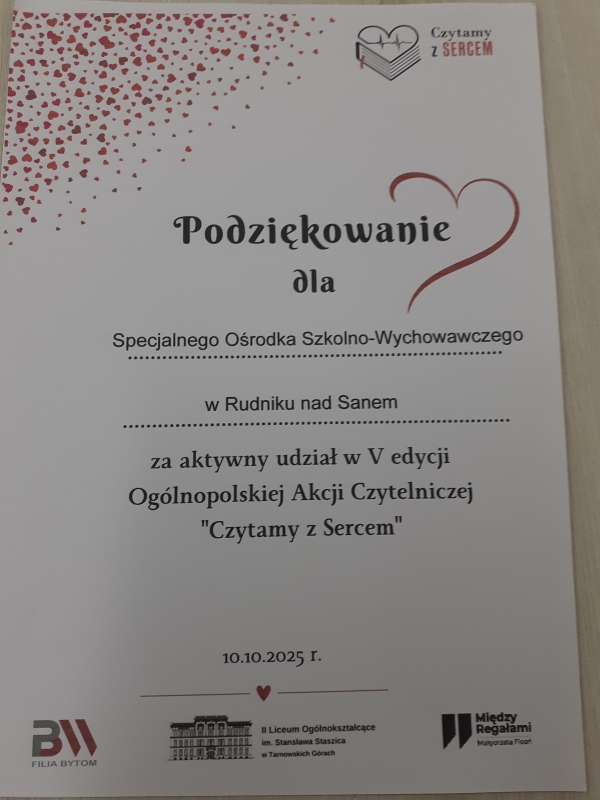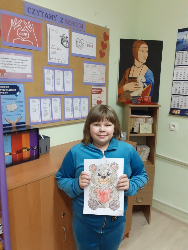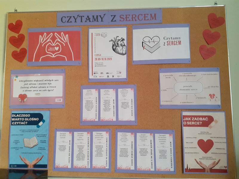 Nasza szkoła wzięła udziału w Ogólnopolskiej Akcji Czytelniczej „ Czytamy z Sercem” organizowanej w ramach obchodu dwóch świąt przypadających na 29 września: Ogólnopolskiego Dnia Głośnego Czytania i Światowego Dnia Serca. Celem akcji była promocja literatury i czytelnictwa, poszerzanie wiedzy uczestników na temat budowy serca, jego funkcjonowania, chorób i profilaktyki. Rozwijanie w uczestnikach akcji wrażliwości na cierpienie i potrzeby osób chorych, propagowanie zdrowego stylu życia. W ramach tej akcji w bibliotece szkolnej wykonana została wystawa „ Alfabet zdrowego serca” oraz gazetka okolicznościowa „Czytamy z Sercem”. Odbyły się zajęcia czytelnicze podczas których, młodzież głośno czytała fragmenty utworów o sercu, uczestniczyła w dyskusji nt. „Dlaczego warto głośno czytać?”, „Jak należy dbać o serce?”, uczniowie poznali budowę i działanie serca, rozwiązywali quiz „Jak dbać o serce?”. W klasach 1-3 odbyły się zajęcia w kąciku czytelniczym. Uczniowie wysłuchali opowiadania „Serce Misia”, poznali zasady zdrowego stylu życia, układali puzzle z ilustracją serca, wykonywali zakładki do książki oraz zadania w kartach edukacyjnych. Nasza szkoła dostała podziękowanie od organizatorów za aktywny udział w V edycji Ogólnopolskiej Akcji Czytelniczej „Czytamy z Sercem”.