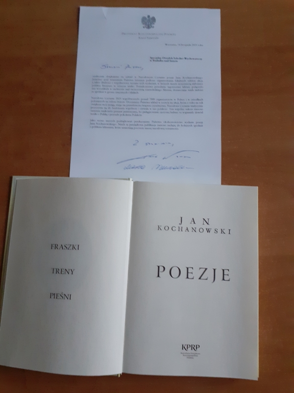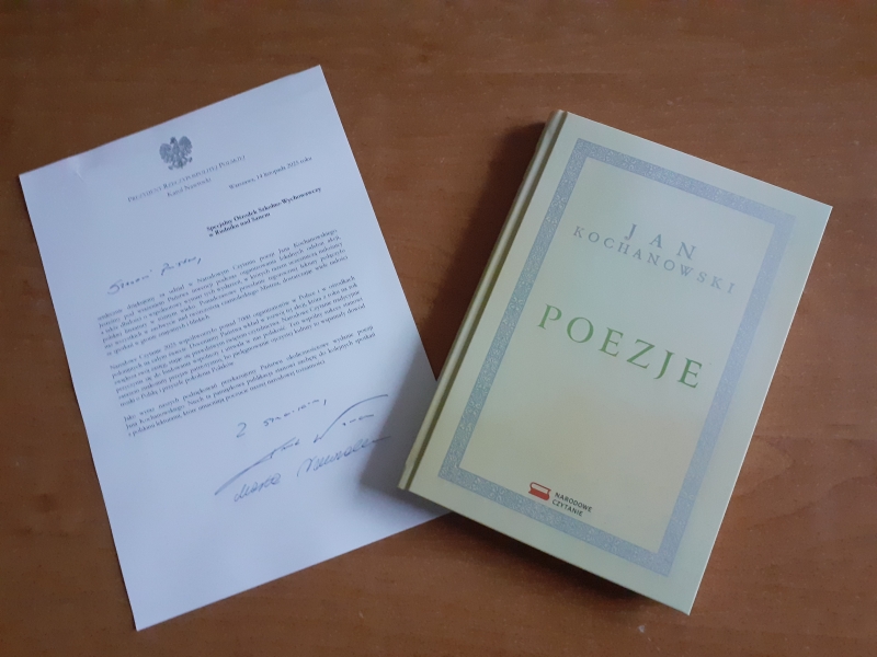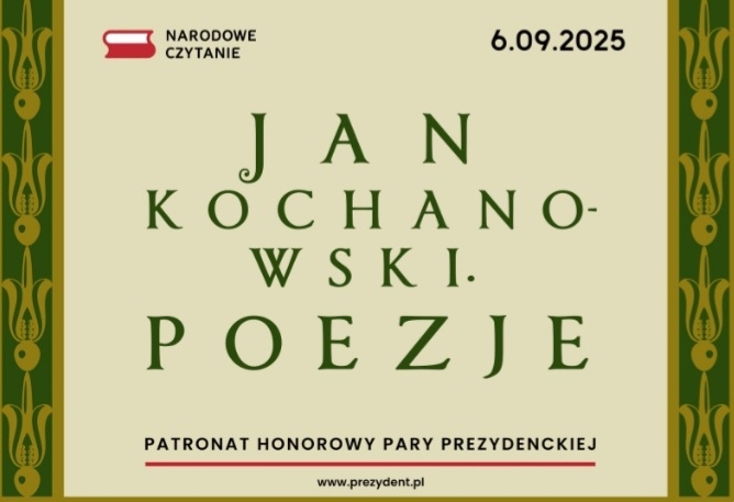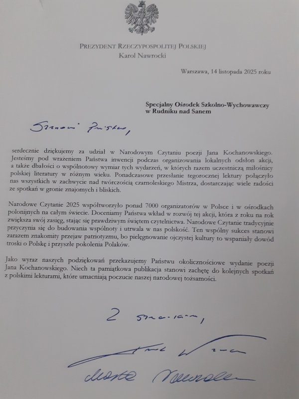 „Czytanie książek to najpiękniejsza zabawa, jaką sobie ludzkość wymyśliła” – Wisława Szymborska Nasz Ośrodek otrzymał oficjalne podziękowanie od Prezydenta RP za aktywny udział w tegorocznym Narodowym Czytaniu 2025 - Poezji Jana Kochanowskiego. To szczególne wyróżnienie jest dowodem uznania dla naszego zaangażowania w szerzenie czytelnictwa i popularyzację polskiej literatury. Do podziękowania dołączone zostało wyjątkowe, okolicznościowe wydanie „Poezji” Jana Kochanowskiego, które stanowi piękną pamiątkę oraz inspirację do dalszego odkrywania klasyki polskiej literatury.