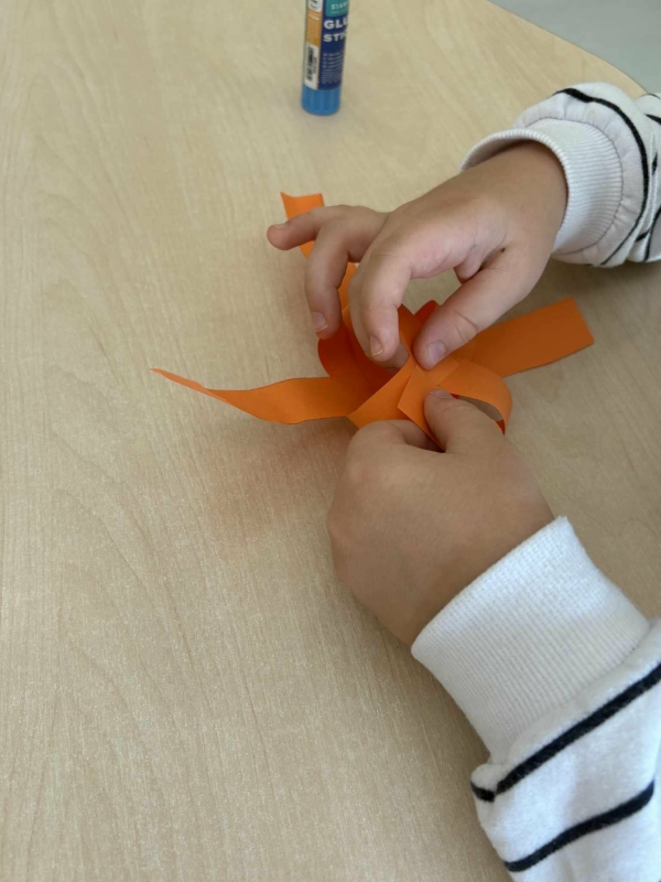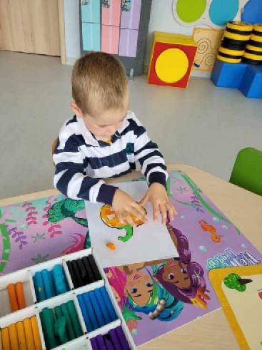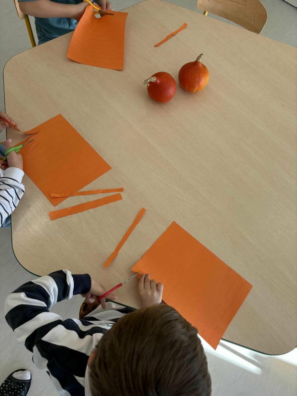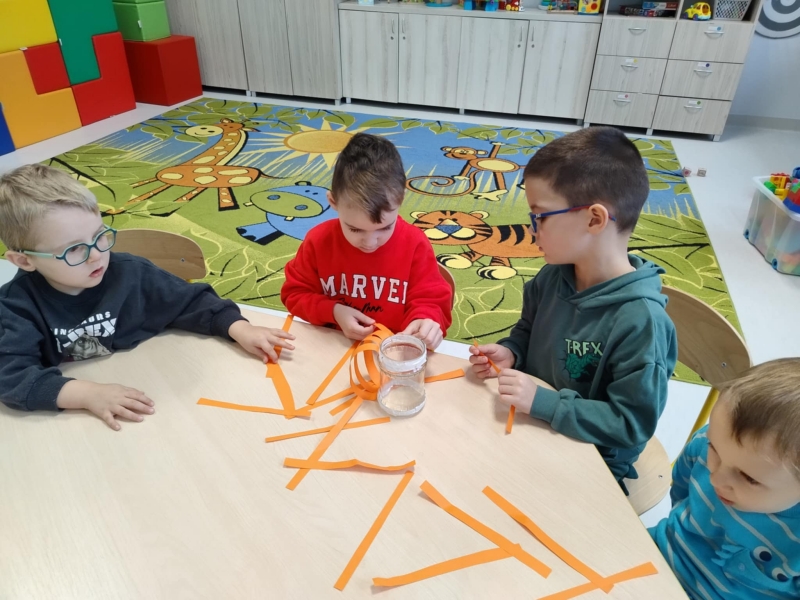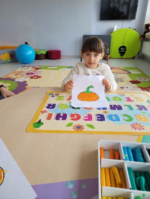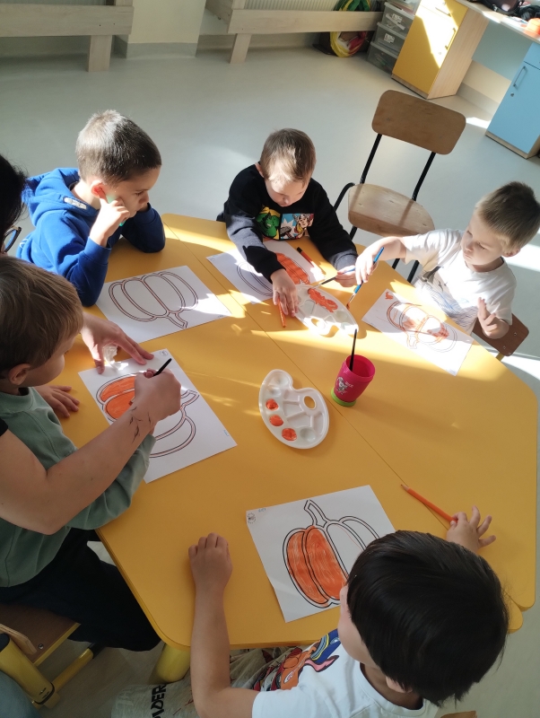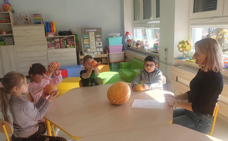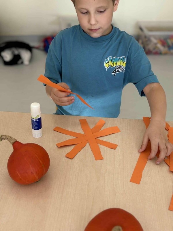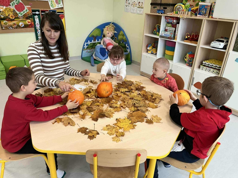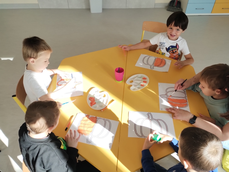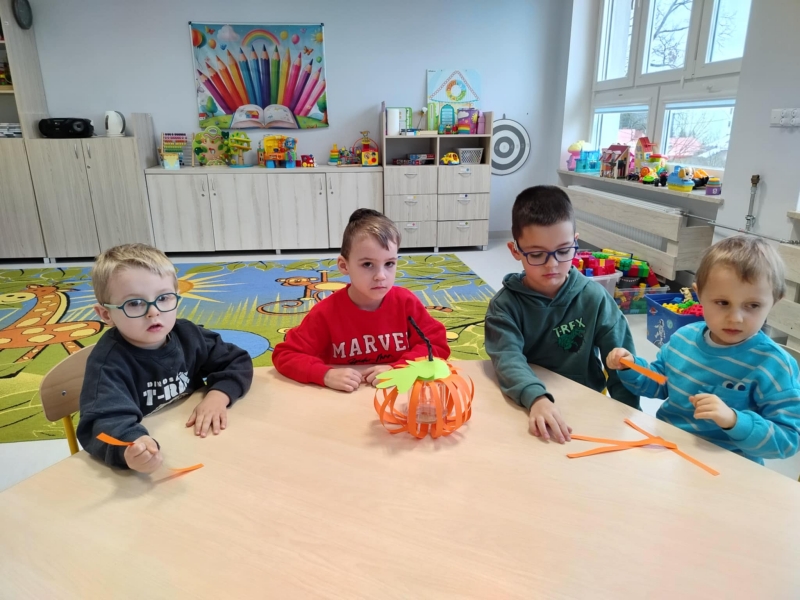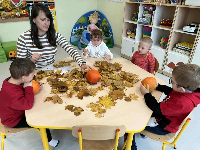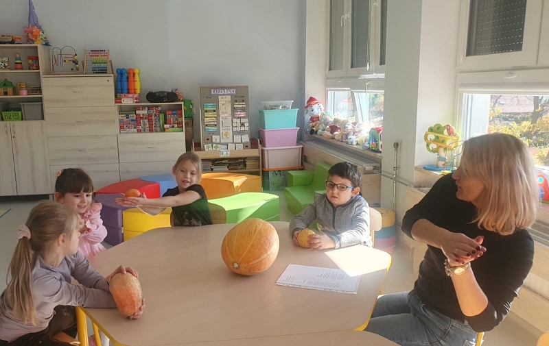 Podczas spacerów dzieci chętnie zbierały wielobarwne liście, żołędzie oraz błyszczące kasztany. W naszych przedszkolnych salach zrobiło się pięknie i kolorowo, a królową jesiennego stołu niezmiennie pozostała dynia. Październikowe zadanie czytelnicze angażowało pamięć przedszkolaków oraz pomagało opanować różnicowanie i określanie kierunków w przestrzeni. Dzieci chętnie nauczyły się wpadającej w ucho dyniowej rymowanki: „Dynie małe, dynie duże/ Dynie w dole, dynie w górze./ Dynie z lewej, dynie z prawej, / dynie kręcą się w zabawie”. Przedszkolaki ćwiczyły określanie kierunków z własnego punktu widzenia podczas zabaw ruchowych oraz utrwalały te umiejętności na kartce wskazując: górę i dół, stronę lewą i prawą. Zajęcia czytelnicze z dynią w roli głównej łączyły zabawę z nauką, czyli to, co małe dzieci lubią najbardziej.