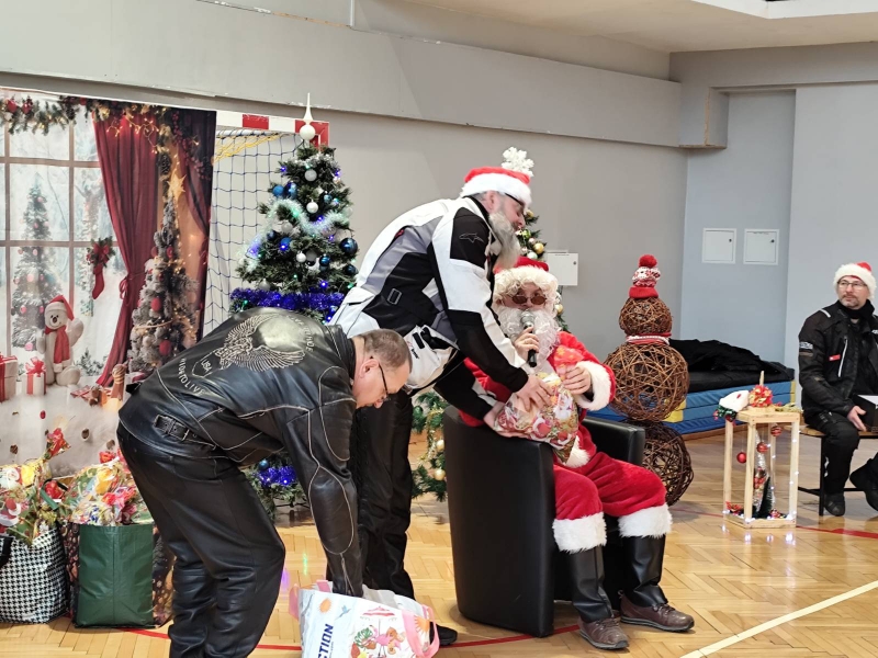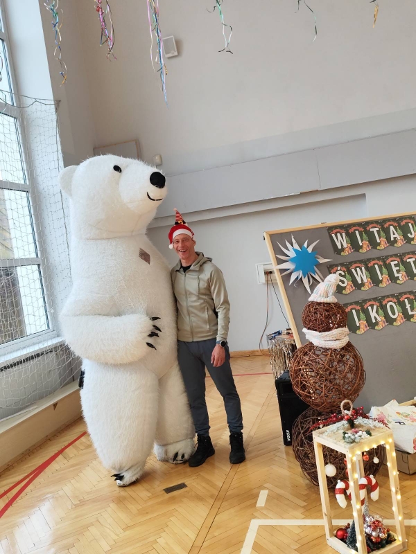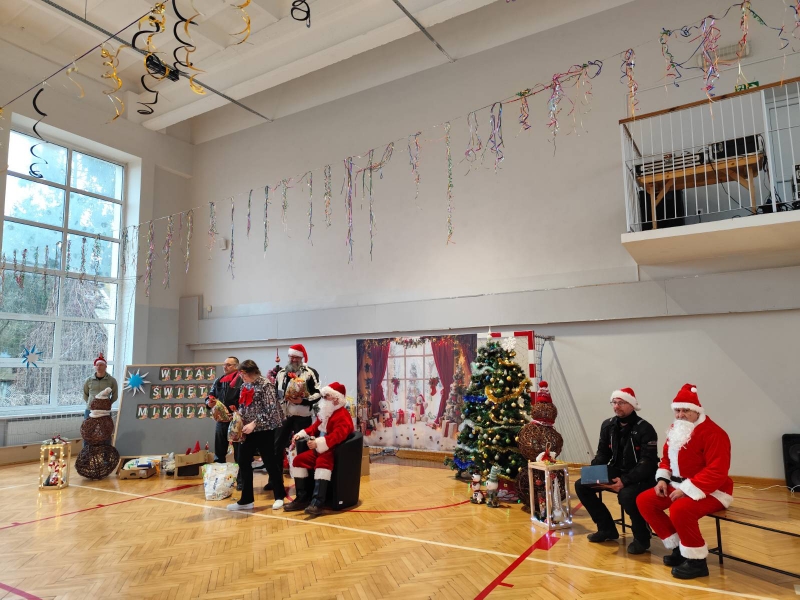 I stało się !!!! Po długich i wyczerpujących przygotowaniach nadszedł ten cudowny czas – 3.12.2025r. naszą szkołę odwiedził Święty Mikołaj. Ale jaką miał ze sobą obstawę!!!! Oprócz pomocników, którzy przyjechali z Mikołajem motocyklami, jako pasażer przyjechał również MIŚ POLARNY, którego spotkali w drodze jadąc do nas w odwiedziny. Nasi uczniowie przywitali przybyłych gości, uśmiechem , brawami i głośnymi okrzykami zachwytu. Mikołaj wręczył wszystkim przybyłym na spotkanie prezenty, łącznie z nauczycielami i pracownikami naszej szkoły. Nikt nie wyszedł z sali bez prezentu od Świętego. Na koniec nasi uczniowie wręczyli prezenty przybyłym gościom, dziękując za wspaniale spędzony czas. Za oprawę muzyczną odpowiedzialny był pan Piotr Trojanowski, za dekorację i zorganizowanie całej imprezy odpowiedzialna była pani Magdalena Zięba. Dziękujemy przybyłym gościom : Mikołaj - p. Jakub Skotnicki; pomocnicy Mikołaja : p. Rafał Pająk, p. Tomasz Rowicki, p. J. Bazan i p. Mariusz Bąk oraz Miś Polarny – p. Dorota Łebko. SERDECZNIE DZIĘKUJEMY.